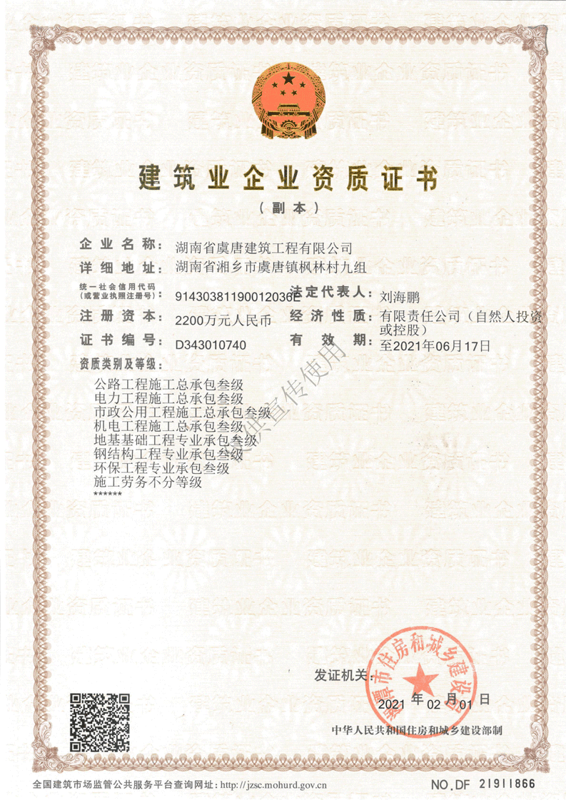 鋼結(jié)構(gòu)專(zhuān)業(yè)承包叁級(jí)、環(huán)保工程專(zhuān)業(yè)工程承包叁級(jí)、承裝(修、試)電力設(shè)施四級(jí)、路面養(yǎng)護(hù)乙級(jí)資質(zhì)、橋梁養(yǎng)護(hù)乙級(jí)資質(zhì)、隧道養(yǎng)護(hù)乙級(jí)資質(zhì)、交通安全設(shè)施養(yǎng)護(hù)乙級(jí)資質(zhì)、施工勞務(wù)不分等級(jí)等多項(xiàng)施工資質(zhì)。