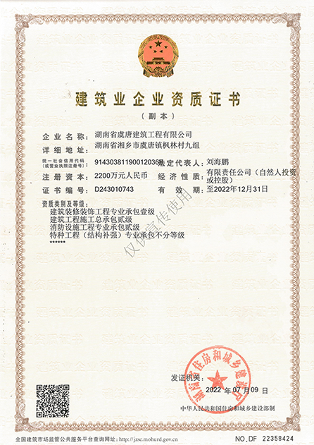 本公司具有建筑工程施工總承包貳級(jí)、消防設(shè)施工程專(zhuān)業(yè)承包貳級(jí)、建筑裝修裝飾專(zhuān)業(yè)承包壹級(jí)、特種工程(結(jié)構(gòu)補(bǔ)強(qiáng))專(zhuān)業(yè)承包不分等級(jí)、